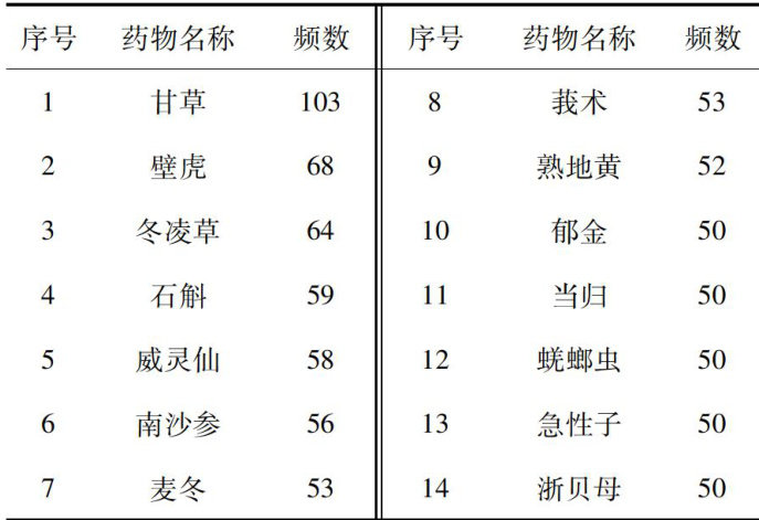 摘要:目的基于数据挖掘技术分析及总结潘立群教授治疗食管癌的用药规律。方法收集、整理及分析2022年1月—2022年12月潘立群教授门诊诊治食管癌的医案,应用中医传承辅助平台(V3.0)的频数统计、关联规则和熵聚类等方法,对数据库中的用药及组方进行统计分析并挖掘核心聚类方药组合。结果共纳入有效处方105首,涉及中药189味;高频中药前10味为甘草、壁虎、冬凌草、石斛、威灵仙、南沙参、麦冬、莪术、熟地、郁金。中药四气五味及归经分布上,寒性及温性药物使用最多;药味使用最多的是苦味药,其次是甘味药;归经以入肺、胃经为主。功效以补虚、活血化瘀、化痰止咳平喘、清热、理气为主。总结出核心药对10个,通过层次聚类分析获得新处方3个。结论 潘立群教授衷中参西论治食管癌,以扶正祛邪为主要原则,突出益气养阴、活血散结的治法,同时注重参考现代医学研究结果选方用药。