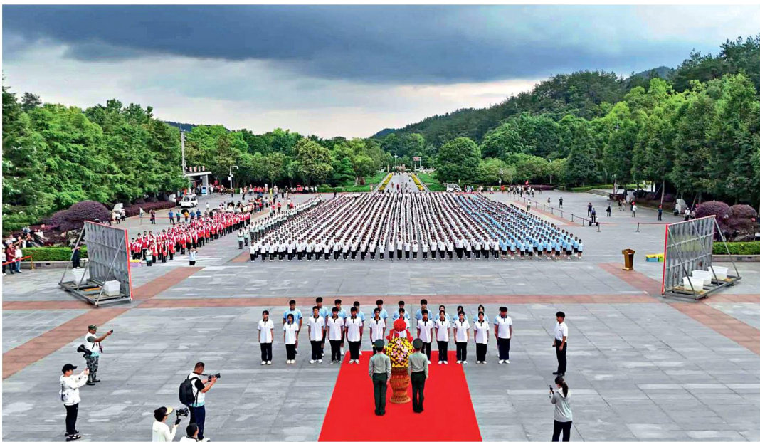 Δ 参与“我的韶山行”红色研学活动的学生在毛泽东广场敬献花篮 习近平总书记在湖南考察时强调“保护好、运用好红色资源,加强革命传统和爱国主义教育,引导广天干部群众发扬优良传统、赓续红色血脉”,为我们深化党性教育、整合红色资源提供了根本遵循。《湖南省干部教育培训规划(2023—2027年)》明确提出,要深入挖掘湖南红色资源,实施“湖湘党性教育品牌四项行动”。我们要深入贯彻落实习近平总书记重要讲话