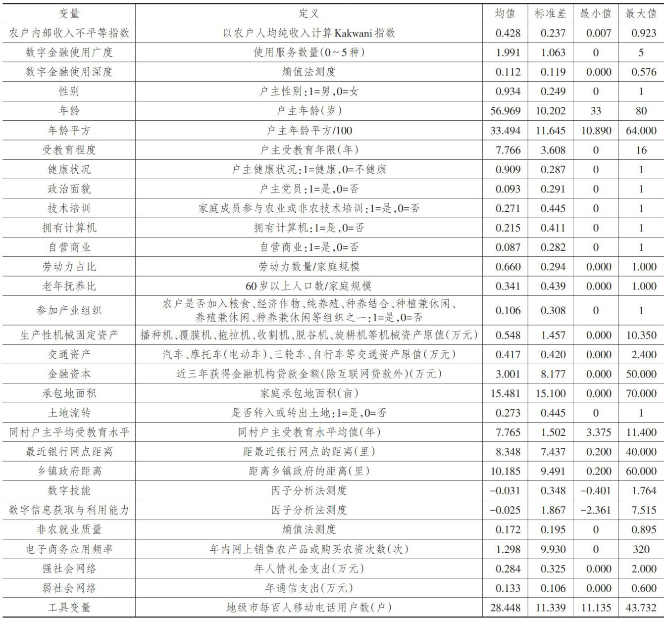 摘要:缓解收入不平等是实现共同富裕的重要途径。文章基于2023年黄河流域中上游地区微观数据,运用条件混合过程(CMP)等模型,探讨数字金融使用程度对农户内部收入不平等的影响效应。研究发现:数字金融使用广度和深度显著缓解了农户内部收入不平等,且使用深度的缓解效应更强,总体上并未出现显著的数字金融“应用鸿沟”,但使用广度和深度均存在显著的门槛效应。数字技能显著强化了数字金融使用广度和深度对农户内部收入不平等的抑制效应。数字金融使用广度和深度通过增强农户数字信息获取与利用能力、自我发展能力和社会网络三条路径缓解农户内部收入不平等,该缓解效应随着农户受教育程度的提高而增强,且使用深度的缓解效应在脱贫户群体中更加显著。