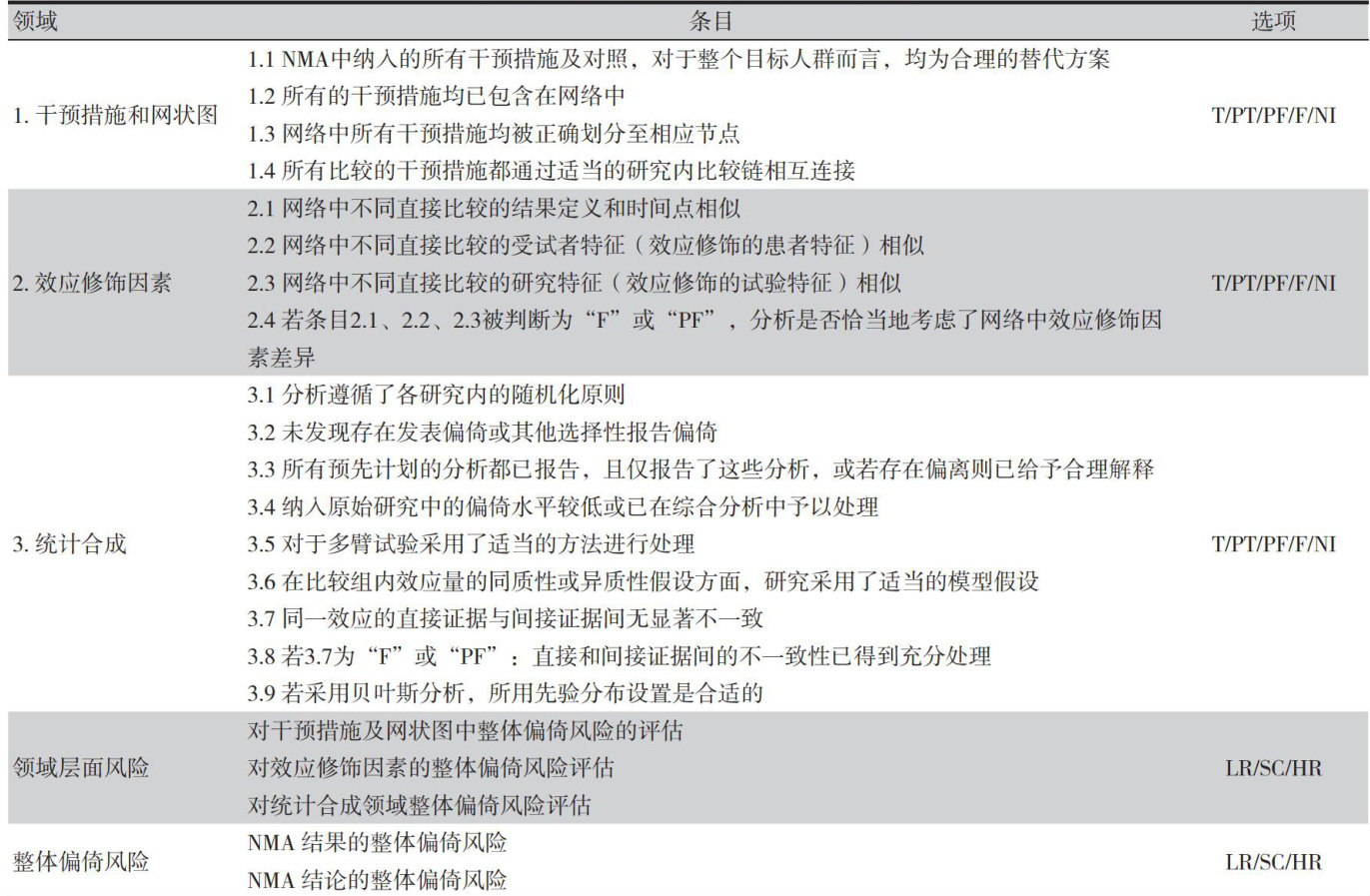 【摘要】现有偏倚风险评估工具主要针对传统两两比较Meta分析,难以全面评估网状 Meta分析所特有的偏倚风险来源。为此,Lunny等研究者研发了针对网状Meta分析偏倚风险来源的评估工具(Risk of Bias in Network Meta-analysis,RoB NMA),专用于评估网状Meta分析在干预选择与网络结构、效应修饰因素以及统计分析等层面可能带来的偏倚。本文旨在解读RoBNMA工具的制订背景、条目内容以及评价流程,为国内研究人员使用该工具提供参考。