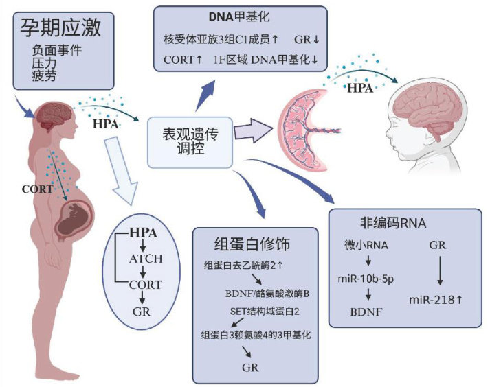 【摘要】随着社会发展和生活压力增加,孕期应激已成为围产期女性面临的重要身心挑战。研究表明,孕期应激可能通过表观遗传调控机制影响胎儿发育编程,干扰神经发育,增加子代出现情绪障碍、行为异常及认知功能缺陷的风险,其中DNA甲基化、组蛋白修饰和非编码RNA等表观遗传修饰可能介导孕期应激对子代认知功能的长期影响。本文综述了表观遗传调控在孕期应激致子代认知障碍中的作用机制,重点分析DNA甲基化、组蛋白修饰及非编码RNA与子代认知功能缺陷的关联,为相关临床干预策略制定提供参考依据。