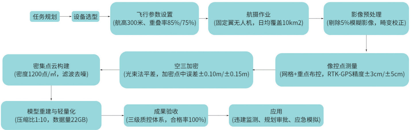 摘 要:本研究针对高密度建成区空间治理难题,以深圳市罗湖区为案例,探究无人机倾斜摄影技术在城市建成区三维建模中的应用路径。通过构建“数据获取—模型构建—监测分析—执法应用”全流程技术体系,验证了该技术在违法建设动态监测、规划土地监察等场景的有效性。研究表明,该技术可实现 0.02m 分辨率实景三维模型构建与季度性影像更新,将违法建设发现时间从平均12 天缩短至3 天,检测准确率达 78.4% ,年度运行成本较传统巡查节约 42% ,显著提升治理精准度与效率,为同类城区提供可复制的精细化管理范式。