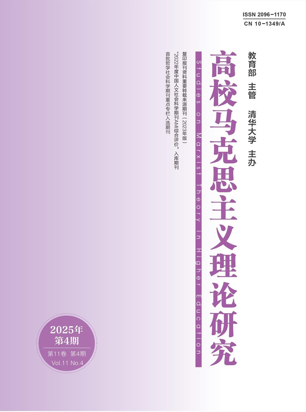 《高校马克思主义理论研究》于2015年创刊,由教育部主管,清华大学主办,清华大学马克思主义学院承担学术组织工作,清华大学出版社出版发行。本刊坚持和巩固马克思主义在意识形态领域的指导地位,服务于高校马克思主义理论研究、马克思主义理论学科建设和高校思想政治理论课建设,反映和提升高校马克思主义理论研究的整体学术水平。