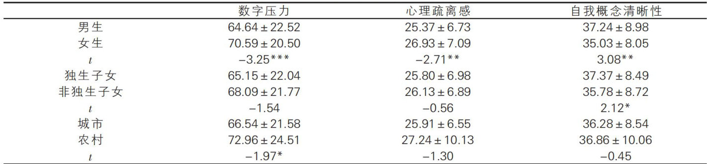 摘要:身处“连线万物”的数字时代,青少年心理疏离现象日益凸显。为探究数字时代中学生心理疏离感的形成机制,构建以自我概念清晰性为中介变量的研究模型。采用数字压力量表、心理疏离感量表、自我概念清晰性量表,对592名中学生开展调查。结果显示:(1)中学生数字压力在性别和家庭所在地上存在显著差异,女生、农村学生的数字压力更高;女生的心理疏离感显著高于男生;在自我概念清晰性方面,男生显著高于女生,独生子女显著高于非独生子女;(2)数字压力、心理疏离感与自我概念清晰性三者之间两两呈显著相关;(3)自我概念清晰性在数字压力与心理疏离感之间起部分中介作用。