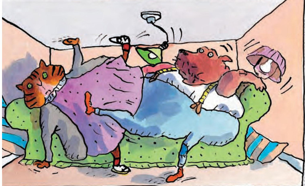 圆圆猫正窝在沙发里。这时,球球狗过来了。他紧挨着圆圆猫坐下,从小到大他们一直都是这样坐的。可今天,他们突然感觉这样坐不舒服了。 “我快被挤扁了。”球球狗说,“沙发怎么变小了?” “不对,是这些垫子长大了!”圆圆猫说,“挤得太难受啦!我们做点儿什么吧!” “做点儿天天都做的事吧!”球球狗说。 于是,他们就吃呀,吃呀;然后睡呀,睡呀。这种感觉太棒了,可等他们睡醒后发现—— 沙发变得更小了,垫