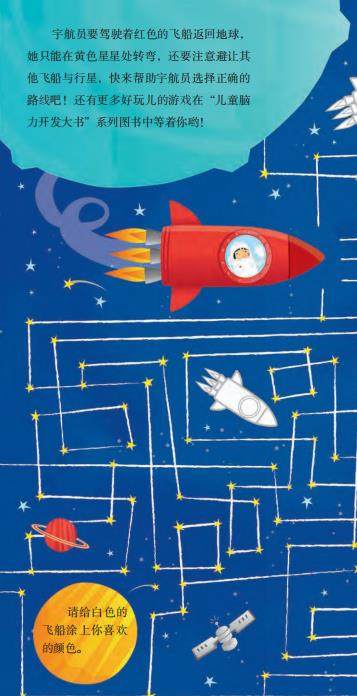 宇航员要驾驶着红色的飞船返回地球,她只能在黄色星星处转弯,还要注意避让其他飞船与行星,快来帮助宇航员选择正确的返回地球路线吧!还有更多好玩儿的游戏在“儿童脑力开发大书”系列图书中等着你哟!