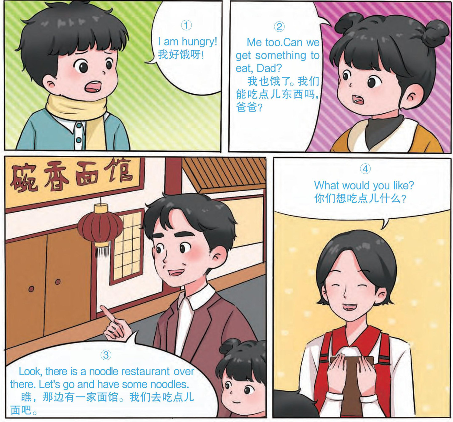 周日,悠悠、艾米和爸爸一起出去玩儿。到了中午,兄妹俩饿极了,于是爸爸带着他俩来到了一家面馆。在这里会发生什么趣事呢?一起来看一看吧! *中文里形容人非常饿时,常用“饿得可以吃下一头牛”。但在西方,则用“饿得可以吃下一匹马”来形容非常饿。