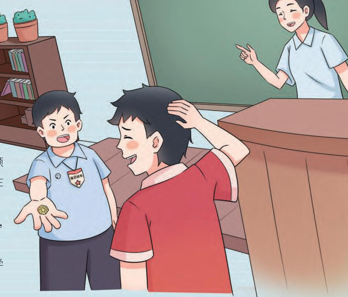 星期一的早晨,胸前别着校徽和博物馆纪念章的酷小呆刚要进班,就被值日班长大力一把拉住了。 “站住,酷小呆!老师不是告诉过我们,除了校徽,胸前别别别的吗?” “你说什么?”酷小呆有点儿蒙。 “还装傻!快摘下来!”大力一边说着,一边把酷小呆的纪念章摘了下来。 张大力,你凭什么抢我的纪念章?还给我! ‘没收了!”大力大声喝道,“都叫你别别别的, 你还别别的!“ 这时,上课铃响了,酷小呆只好咽下