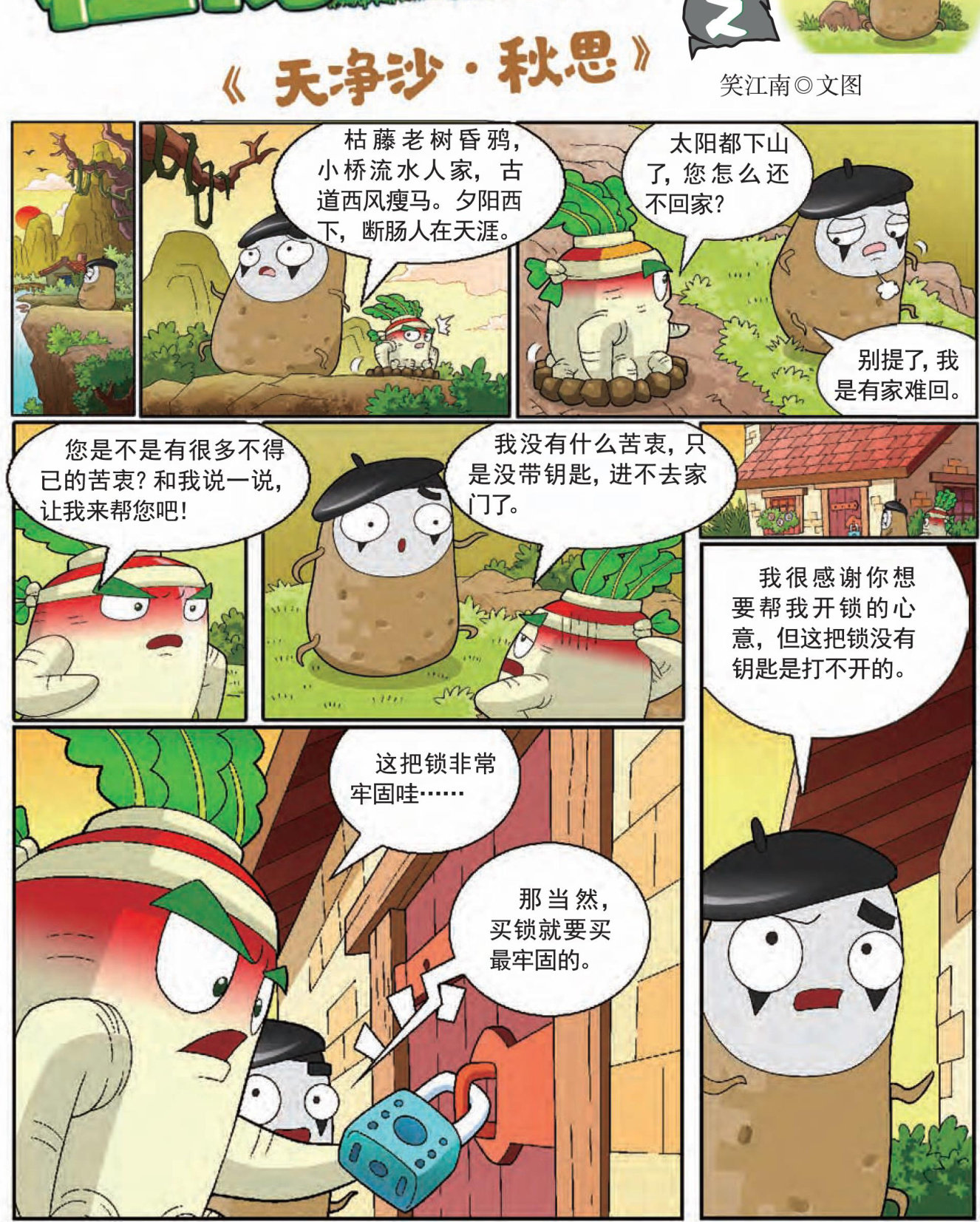 植物大战僵尸之《天净沙·秋思》 天净沙·秋思 [元]马致远 枯藤老树昏鸦, 小桥流水人家, 古道西风瘦马。 夕阳西下, 断肠人在天涯 诗词释义 枯藤缠绕着老树,树枝上栖息着黄昏时归巢的乌鸦。小桥下,流水潺潺,桥旁还有几户人家。在古老的道路上,秋风萧瑟,一匹瘦马正在前行。夕阳缓缓西下,极度忧伤的旅人漂泊在天涯。 作者简介 马致远,元代著名戏剧家,在戏曲创作方面的艺术成就很高。他