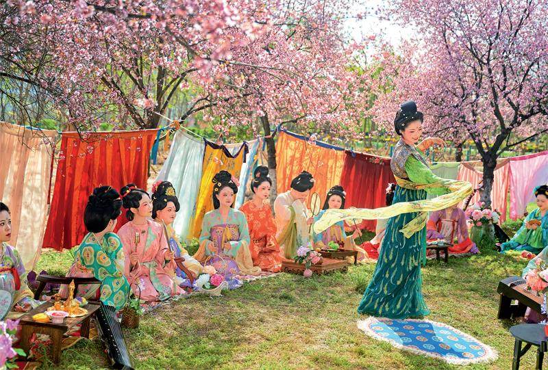 春日晴空,西安河堤路的草坪上,桃花开得正好。20多名身着唐制汉服的年轻人围坐其间,用金屏风与衣裙隔出一方雅致空间。 女生们着齐胸襦裙,眉间点花钿,面上淡施胭脂。一人抚古筝,其余人或赏花低语,或举杯浅笑。席间留出一方空地,两名扮作力士的年轻人上场角抵助兴,一人着翻领窄袖胡袍,一人穿圆领唐装,喝彩声飘散在春日里。 这并非影视剧片场,而是一场名为“裙幄宴”的汉服复原活动。《开元天宝遗事》记载:“