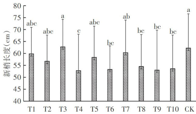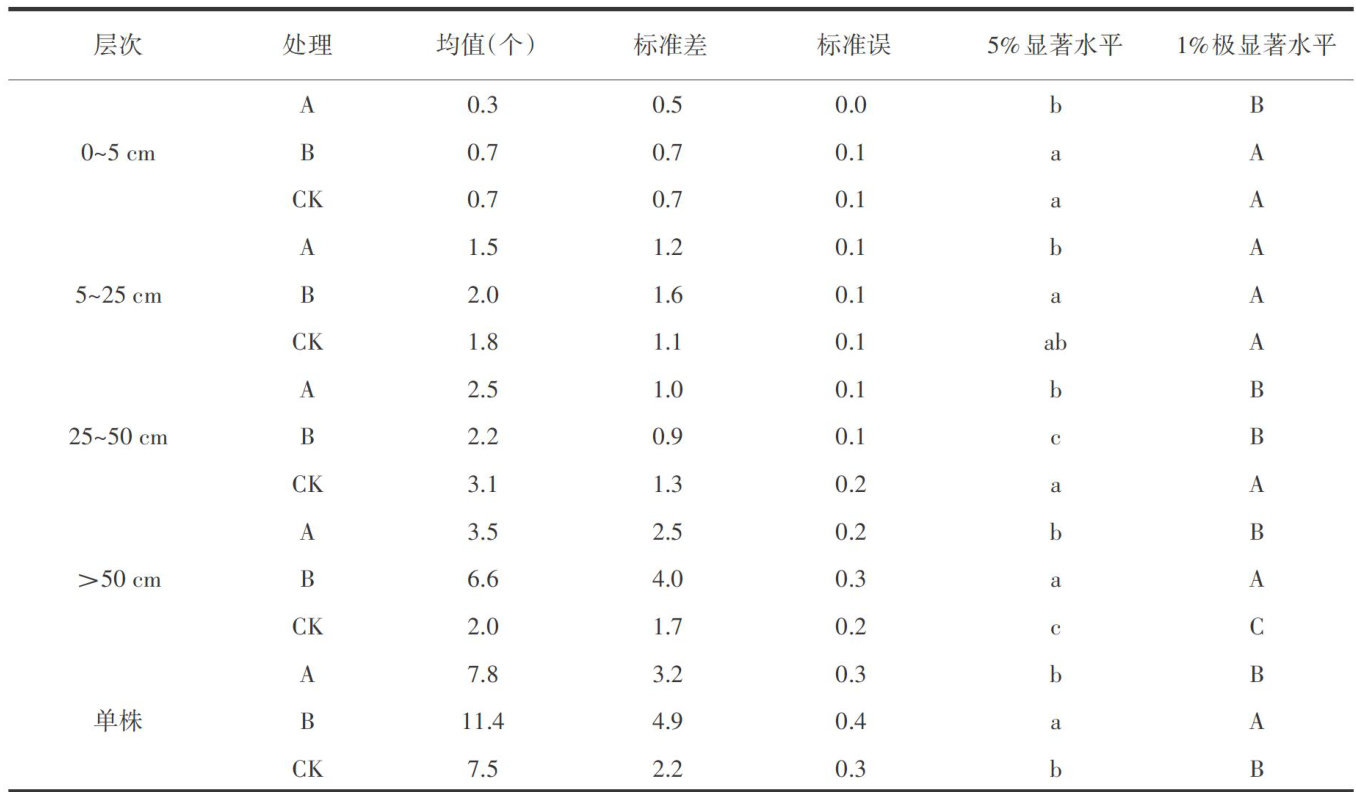 摘要:本试验通过配置两种化学封顶剂处理(处理A:胺鲜·甲哌鎓 10g/667m2+24 表芸苔素内酯·烯效挫 10g/667m2o 处理B:胺鲜酯 5g/667m2+ 糖醇锌 30g/667m2+ 伽马氨基丁酸 5g/667m2+ 月桂酸二乙醇酰胺 30g/667m2 ,以人工打顶(摘除顶部一叶一心)为对照,旨在研究不同化学封顶剂对植株棉铃空间分布影响。结果表明,处理B的单株棉铃11.4个,比人工打顶(7.5个/株)多3.9个,且存在显著差异。处理B与人工打顶( 0~5cm 结铃率均大于 50% ,处理B单株棉铃≥7个占 84.0% ,比人工打顶多 16.4% 。综合各空间部位结铃率和铃数占比,处理B优于处理A和CK。