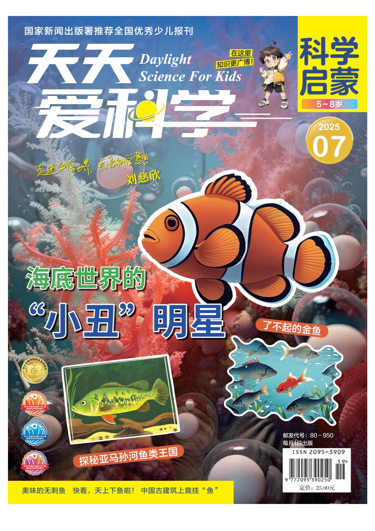 阅读了本期《天天爱科学》,你一定学会了很多知识就让我们用下面的问题来检验一下吧! 1.金鱼的祖先是谁? ④ 鲨鱼 B 鲤鱼 ⑥ 鱿鱼 ① 鲫鱼 2.“鱼雨节”是哪个地方的节日? 澳大利亚 B 中国 洪都拉斯 ① 新加坡 3.谁是“淡水鱼之王”? ④ 食人鲳 B 巨骨舌鱼⑤ 电鳗 眼点丽鱼 4.星期制度是谁创立的? 古巴比伦人 ③ 古印度人⑥ 古希腊人 ① 古罗马人 5.小丑