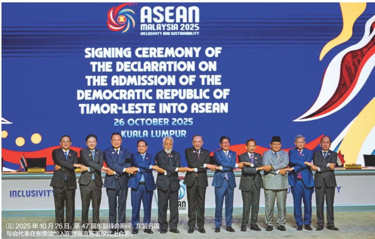 2025年实在谈不上是太平的一年,西方主导的传统全球化退潮、保护主义加剧、地缘政治冲突频发,人心惶惶不安。但地处风暴眼的东盟在轮值主席国马来西亚的引领下,不仅保持了区域团结,还通过各种制度性跨越和务实合作向世人展现了“韧性、创新、以人为本”的亚洲新愿景。 在第47届东盟峰会上,最振奋人心的一幕是东盟大家庭实现了大团圆。东帝汶在经历十多年的努力后终于加入东盟,这标志着“一个东南亚”的物理完成,凸显