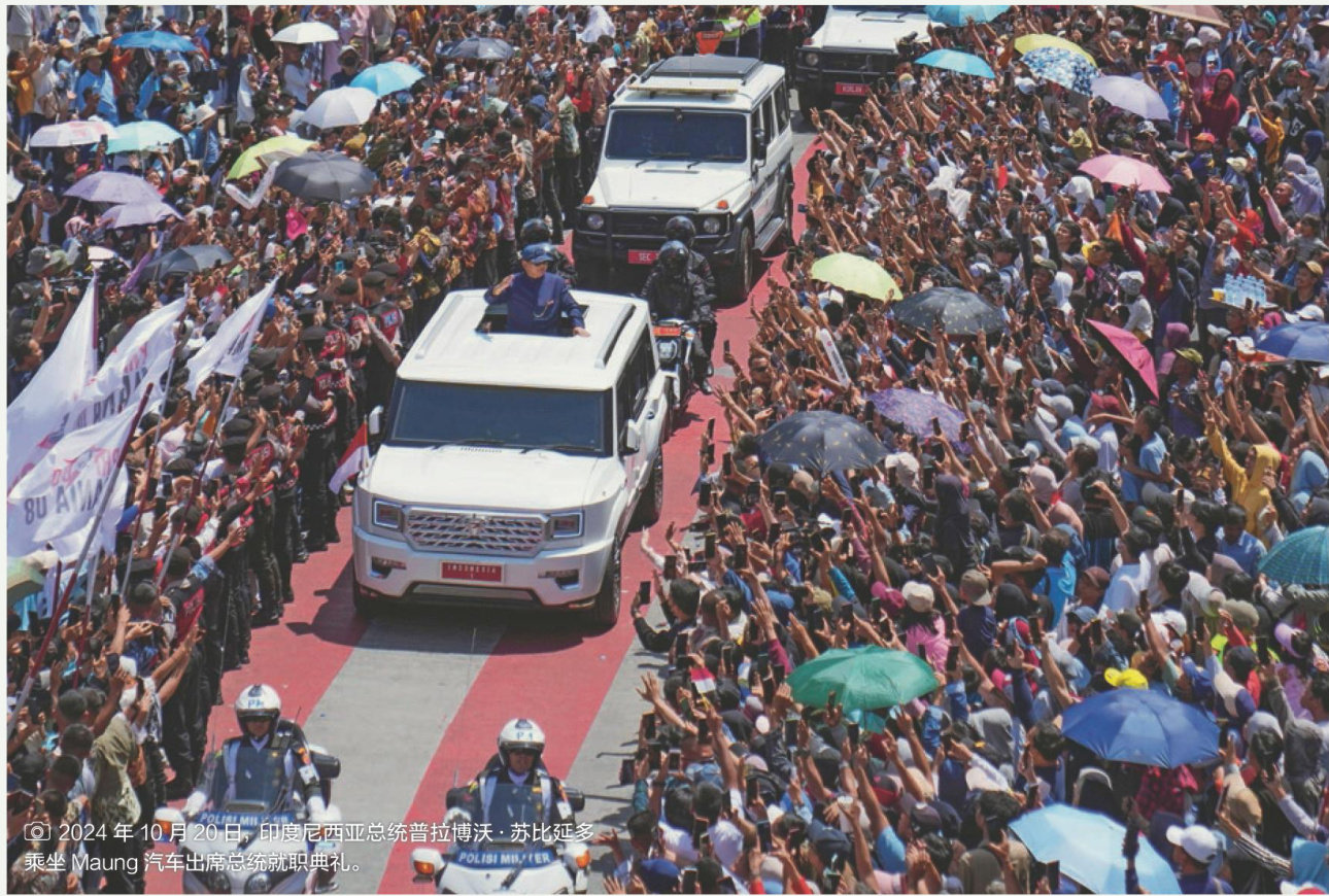 2024年10月20日,当普拉博沃·苏比延多出席总统就职典礼时,他乘坐着一辆MV3GarudaLimousine驶过雅加达街头。这辆称为“Maung”(巽他语意为“老虎”)的防弹SUV由印度尼西亚国营军工企业PTPindad生产。在很多当地人眼里,Maung不仅是一辆车,更是印度尼西亚制造业自力更生的象征。 印度尼西亚国产车的代表 Maung汽车原本是PTPindad开发的 4×4 轻型战