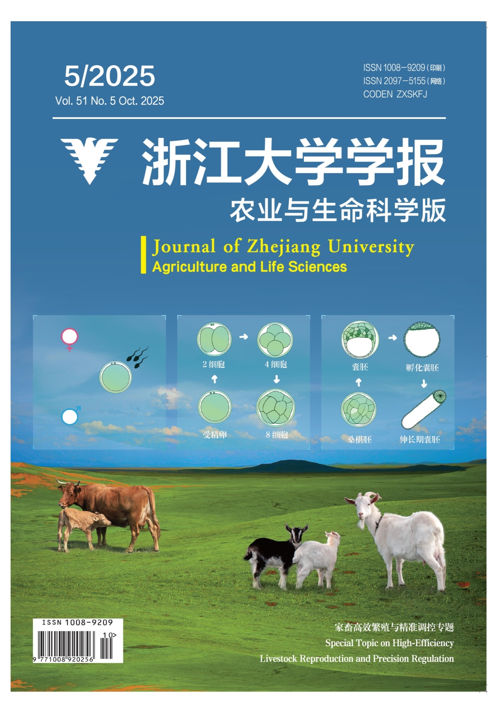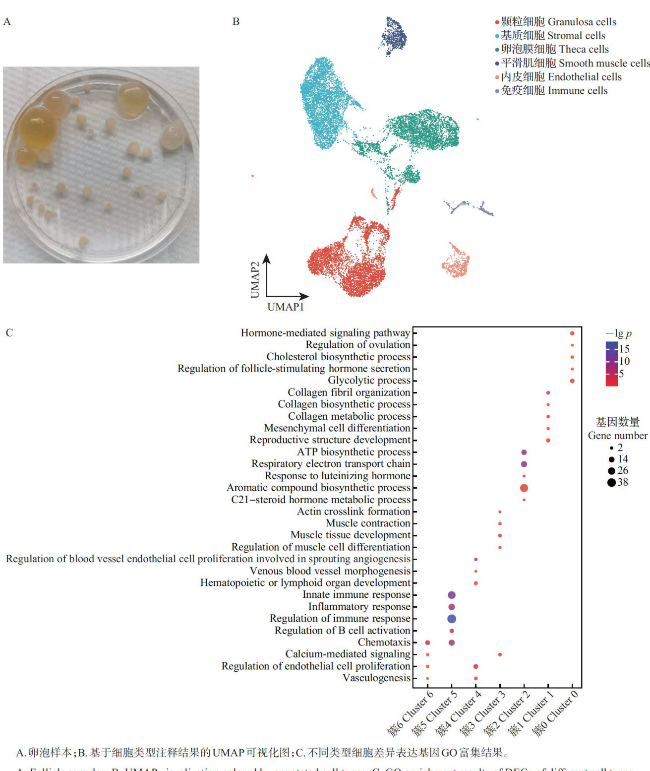 摘要窦卵泡发育调控涉及多层机制,其研究受制于对卵泡真实的微环境及关键分子事件的低效捕捉。本研究利用单细胞RNA测序(single-cellRNA sequencing,scRNA-seq)技术,绘制了常用牛体外胚胎生产的 3~8mm 卵泡单细胞图谱,并探讨了卵泡细胞异质性、差异表达基因、细胞发育分化轨迹及细胞通信等分子特征。结果表明:颗粒细胞、基质细胞、卵泡膜细胞、平滑肌细胞、内皮细胞和免疫细胞6种细胞[细胞标志物分别为抗米勒管激素(anti-Mullerian hormone,AMH)、核心蛋白聚糖(decorin,DCN)、类固醇生成急性调节蛋白(steroidogenic acuteregulatory protein,STAR)、ACTA2(actin alpha 2,smooth muscle)、血管性血友病因子(von Wilebrand factor,VWF)、CD14]参与构成牛窦卵泡微环境,其中颗粒细胞是驱动窦卵泡发育的关键细胞类群。颗粒细胞的4个亚群[细胞标志物分别为细胞色素P450家族19亚家族A成员1(cytochrome P450 family19 subfamily A member1,CYP19A1)、POU类5同源框1(POUclass 5 homeobox 1,POU5F1)、着丝粒蛋白F(centromere proteinF,CENPF)、成纤维细胞生长因子10(fibroblast growth factor10,FGF10)]高度异质,并呈现出“信号转导 $$ 转录调控 $$ 增殖分裂 $$ 功能成熟”的分化轨迹,协同抑制素/抑制素βA(inhibin/inhibin betaA,INH/INHBA)及其他免疫调节通路的激活,重塑牛卵泡发育微环境并驱动卵泡选择程序的开启。此外,在单细胞水平上提供了卵泡膜细胞内外层结构分化路径和淋巴内皮细胞存在的分子证据。本研究结果为深入解析牛窦卵泡发育调控机制及优化牛体内外胚胎生产技术体系提供了新视角。