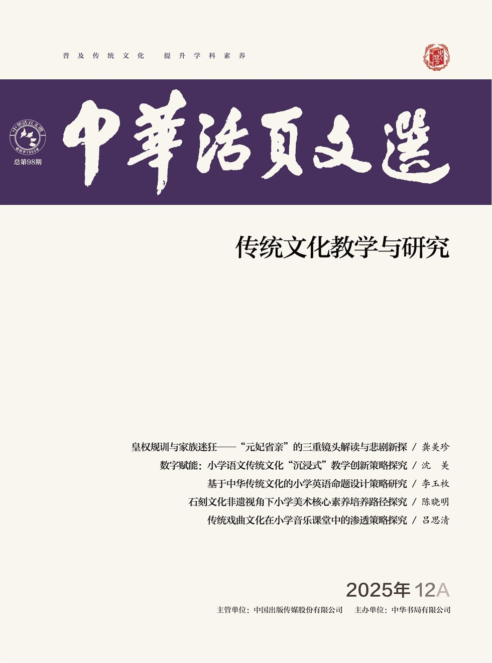 "中华活页文选(传统文化教学与研究)由中宣部中国出版传媒股份有限公司主管,百年历史的中华书局主办,面向全国发行以中华传统文化为特色的阅读教辅类月刊。 坚持正确的舆论导向和办刊方向,传播和弘扬中华优秀传统文化,提升中小学教师传统文化素养,为广大中小学教师搭建传统文化教学和语文教学的交流平台。"