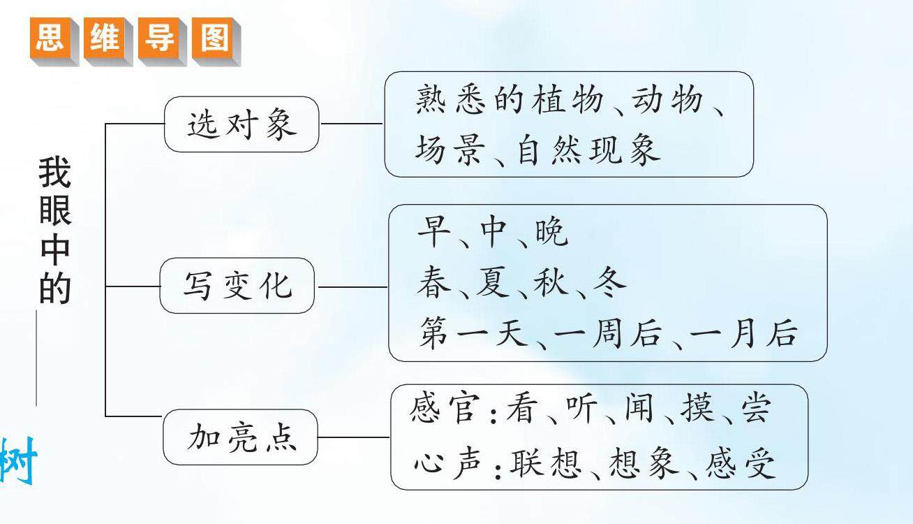 模拟文题 草地有时绿,有时黄;叶子有时落,有时长;云朵有时聚,有时散;月亮有时圆,有时缺……亲爱的同学们,只要仔细观察,你就能发现,生活中的许多事物都在不断变化。请你以“我眼中的______”为题,写一篇习作。 构思引路 1.选择对象抓特点。题目要求我们描写事物的变化,所以要选择那些在我们的观察中发生了变化的事物。比如,桂花树——春天长出小船般的新叶,秋天缀满香喷喷的小花;小猫——有时懒洋洋