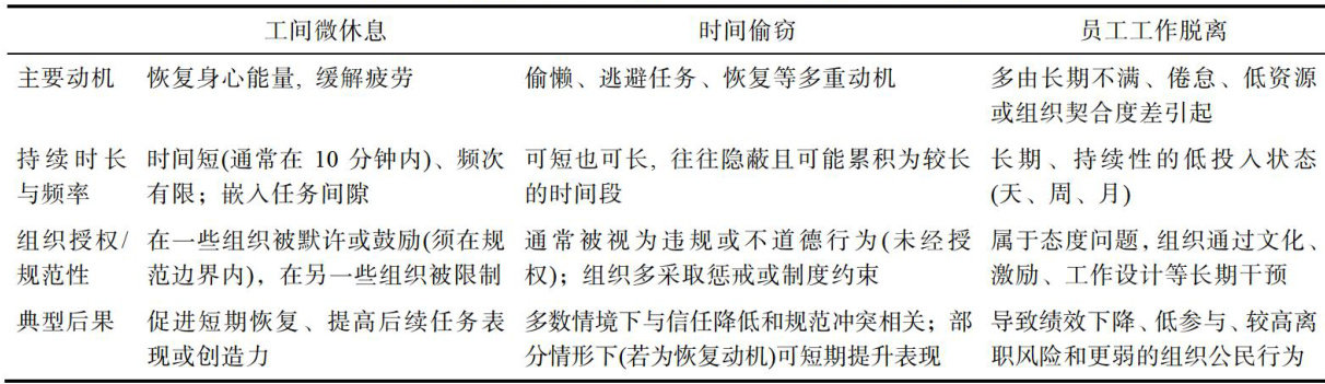 摘要工间微休息是员工在工作间隙恢复身心能量的重要方式。以往研究主要倡导工间微休息的益处,而企业过多关注工间微休息的代价,造成理论与实践之间的矛盾。为了更全面地审视工间微休息的影响后果,本研究基于资源保存理论和人际知觉理论,分别以员工自身、直属上司、平级同事为主要视角,探究员工工间微休息对自身行为、上司奖惩、同事社交的双刃剑效应,识别工间微休息的利与弊。在此基础上,结合“天时·地利·人和”中国传统哲学智慧,提出上述双刃剑效应的调节机制,启发员工在工间微休息过程中如何扬长避短。本研究有助于融合工间微休息领域的观点分歧,建立一个更加完善的工间微休息理论体系,推动工间微休息理论的辩证式发展。