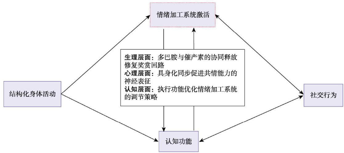 摘要孤独症谱系障碍的核心社交障碍表现为内源性社交动机缺失与外显互动行为缺陷,其深层机制与情绪加工系统的多层级功能障碍密切相关。基于已有理论和实证研究结果,本研究提出“情绪加工系统激活驱动的动态调节模型”,系统阐释结构化身体活动通过多层级情绪加工系统激活改善孤独症儿童社交障碍的作用路径。模型突破传统结构化身体活动的线性因果框架,揭示结构化身体活动通过“情绪加工系统激活-认知调节-行为反馈”动态循环重构孤独症儿童社交功能的内在机制。
