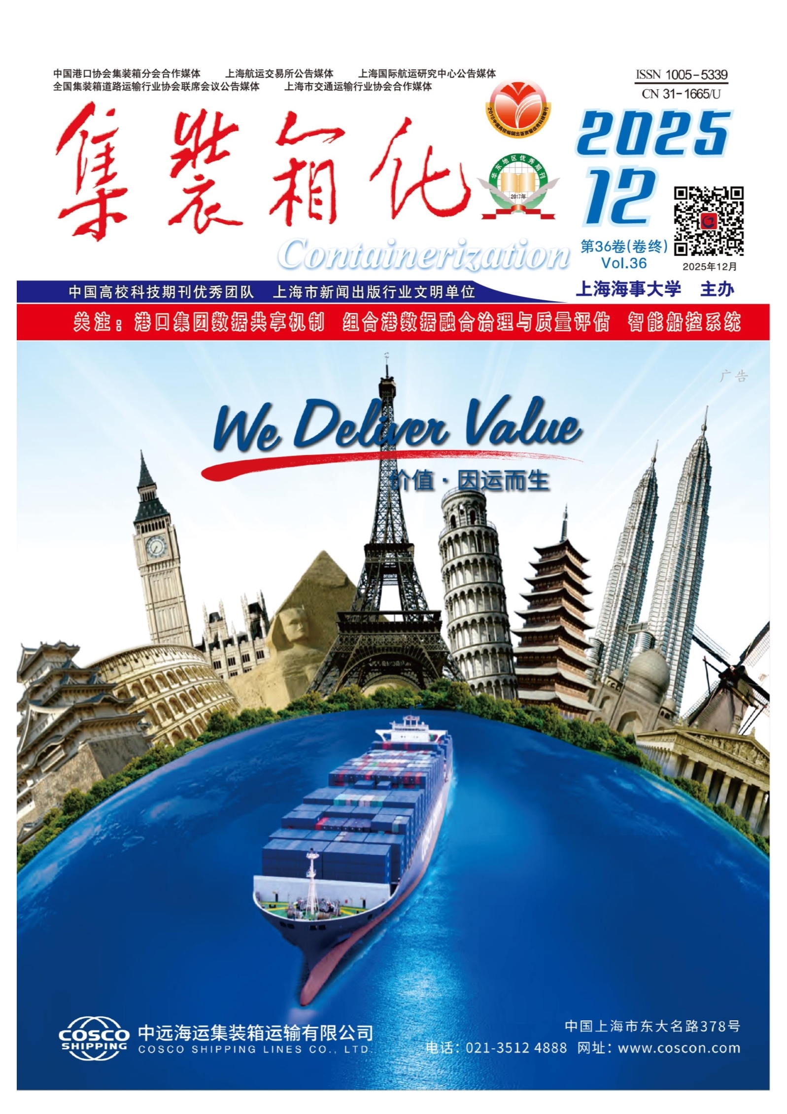 《集装箱化》杂志创刊于1990年,是由上海海事大学主办的全彩页月刊。作为面向国内外公开发行的集装箱运输领域的专业期刊,本刊始终坚持正确的舆论导向和办刊方向,严格遵守期刊出版的政策和法规,秉承为行业服务的宗旨,凭借全面、深入、广泛、及时的媒体传播优势,为航运、物流、港口、造船、贸易、信息、咨询、机械设备和集装箱制造等企业搭建良好的交流平台,成为业内企业获取行业信息和商机的重要渠道。 本刊立足集装箱