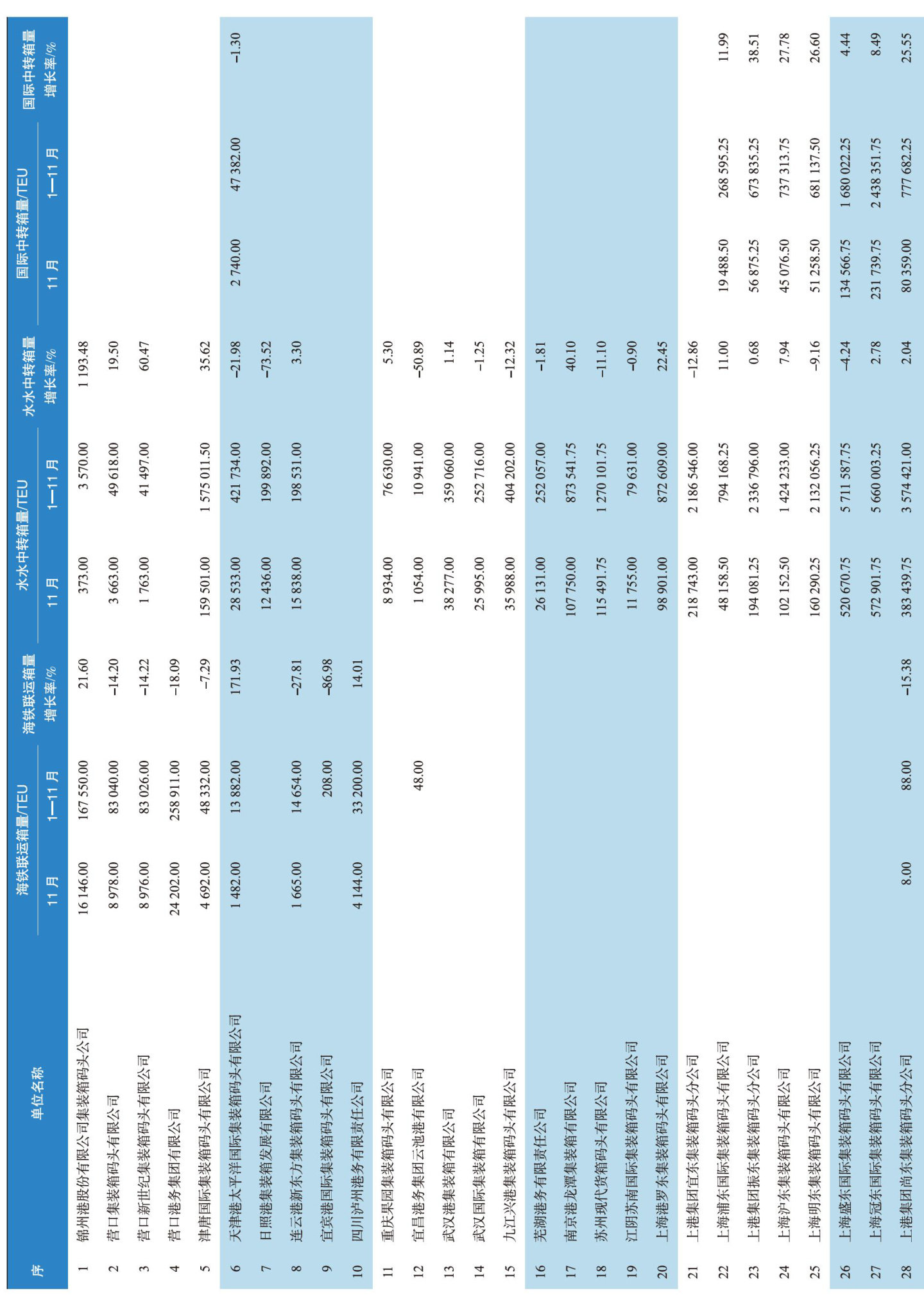 中国枢纽港集装箱码头多式联运吞吐量快报(2025年11月)
