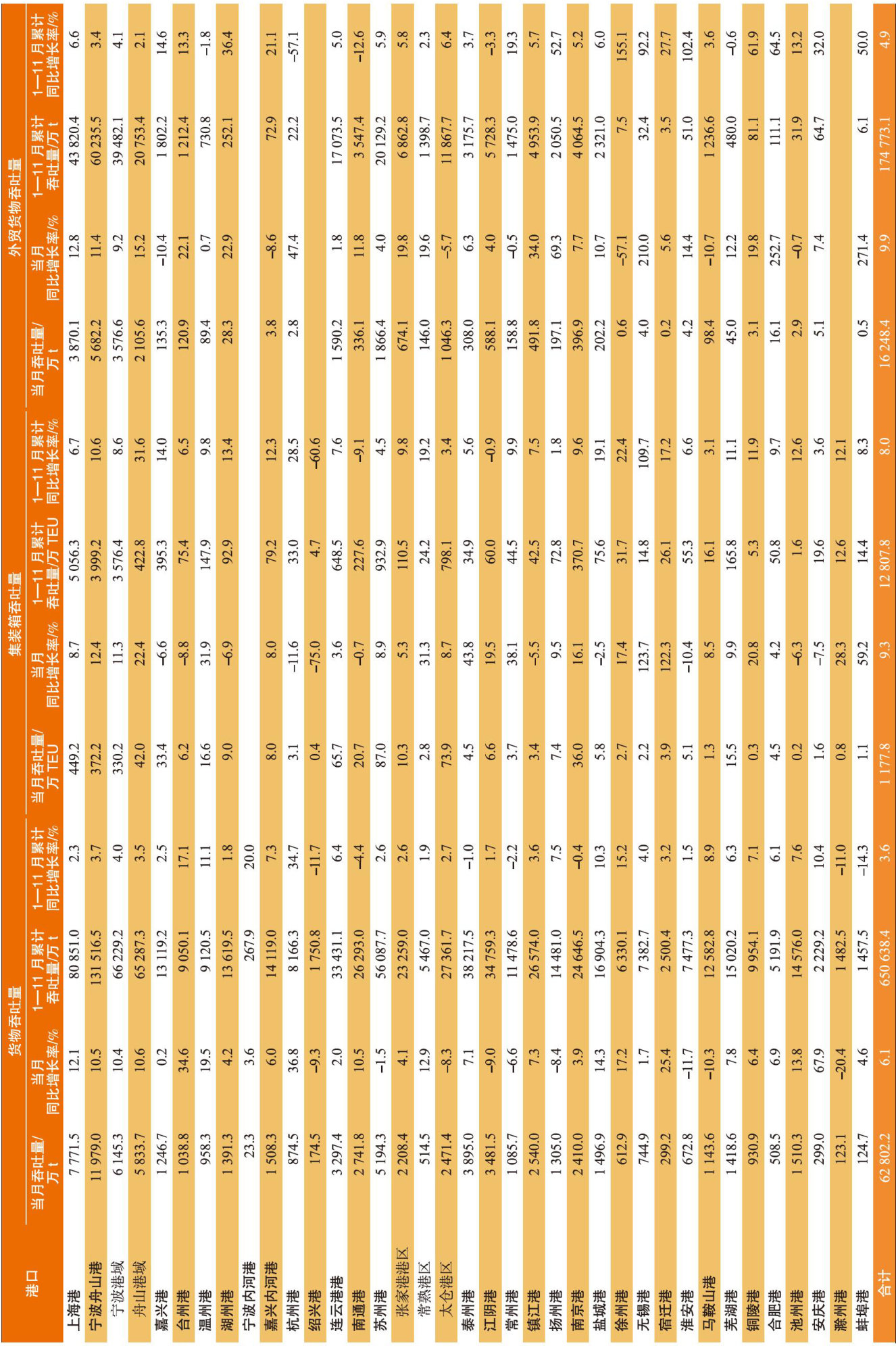 2025年11月长三角地区主要港口吞吐量