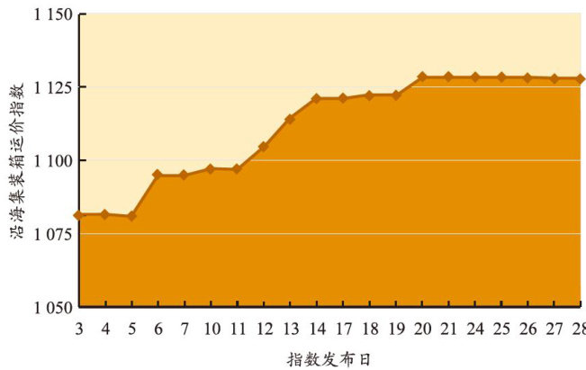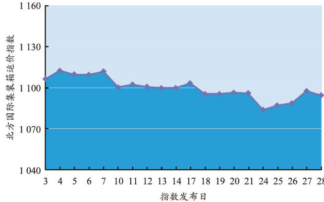 天津航运指数下设的沿海集装箱运价指数包括沿海集装箱出港运价指数(以下简称“出港指数”)和沿海集装箱进港运价指数(以下简称“进港指数”)。2025年11月,沿海集装箱运价指数共发布20次(见图1):上旬至中旬,指数大幅上涨;下旬,指数维持高位。11月3一20日,进港指数和出港指数持续小幅上涨,带动沿海集装箱运价指数于11月20日升至月内最高点1128.43点。临近月末,出港指数微幅回落,沿海集装箱运