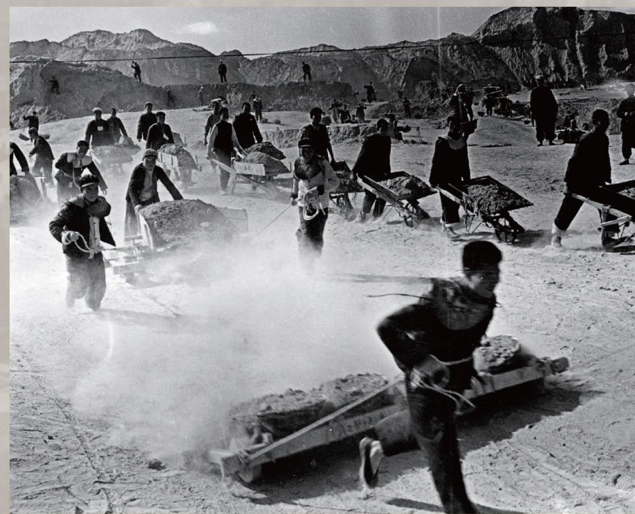 在中国,地下有兵马俑,地面有比金字塔还高的刘家峡大坝。就在兵马俑被发现的1974年,这座当时中国第一、世界第三、亚洲第一的大型水电厂5台机组全部发电运行。1975年2月5日,《人民日报》头版头条刊发《我国最大的水电站一刘家峡水电站胜利建成》。这是刘家峡水电站第一次在全国新闻媒体上被披露,这个深藏黄河峡谷的“巨无霸”横空出世,中华民族再度吸引世人的眼球。 刘家峡大坝建设时期—开挖平台土方 新
