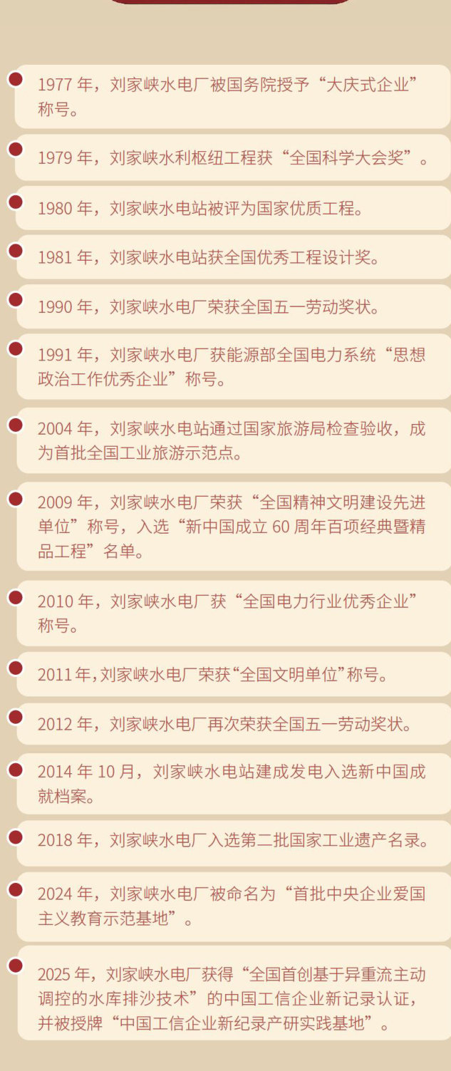 刘家峡水电厂被誉为“水电明珠”,又被誉为“黄河明珠”“高原明珠”。刘家峡水电厂是为祖国、为人民提供电力、输送光明的,“明珠”的比喻对于刘家峡水电厂来说可谓生动、贴切。让刘家峡水电厂光芒闪耀的,不仅有它那日夜轰鸣运转的发电机组和它那跨越万水千山的330千伏超高压输电线路,还有在刘家峡水电站的建设、生产实践中凝聚成的精神- 一新时代刘电精神。 水电明珠刘家峡水电厂 刘家峡水电厂有一串令人难以置信的