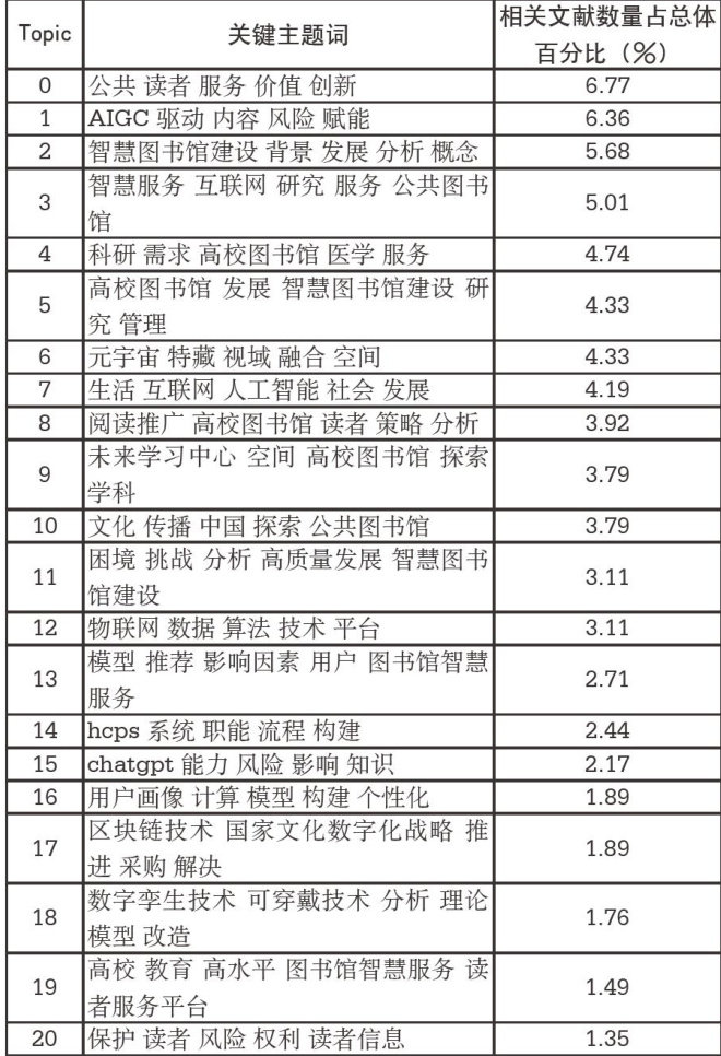 摘要:本文利用BERTopic模型挖掘文献主题,结合桑基图及其演化趋势对国内智慧图书馆研究现状进行分析。智慧图书馆研究历经从理论构建到技术驱动实践、再到数智化转型与融合的演进脉络,从技术场景应用向政策体系完善、标准规范建构、伦理价值探索等维度的协同发展,智慧图书馆正在向“技术一服务一生态”的数智化协同发展。